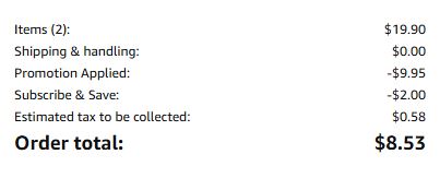 Once at checkout, I went down and clicked the Subscribe & Save options for both items which gave me an extra 10% off both items!