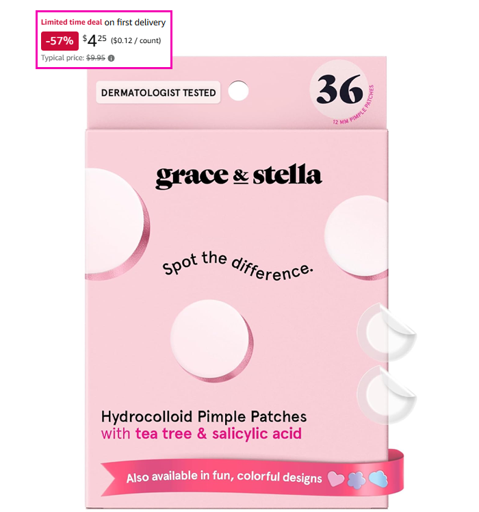 grace & stella Pimple Patches with Hydrocolloid, Salicylic Acid, & Tea Tree Oil (36 Count) for $5.00 (reg $9.95)