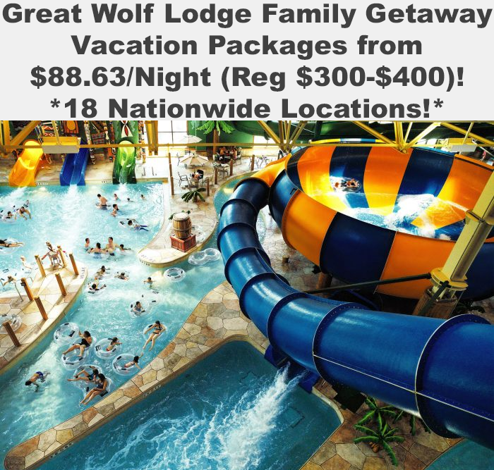 Great Wolf Lodge Resorts are located across the country and you can currently get a deal! With code GWL5, acation packages start as low as $88.63 per night for 2-night stays (regularly $300-$400/night), depending on the size of room, location, and dates you choose. Additional resort fees will be added at purchase.
