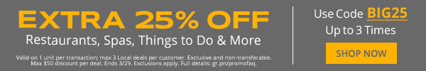 Through today, select Groupon customers can get an extra 25% off up to 3 deals! Head over to Groupon and look for a banner like the one pictured above to see if your eligible, or try code BIG25 on a deal.
