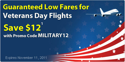 Guaranteed Low Fare for Veterans Day Flights, Save $12 with Promo Code MILITARY12. Book Now!