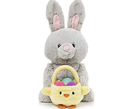 - SWEET EASTER BUNNY PLUSH WITH BASKET: This 10″ super-soft plush gray Easter bunny is the perfect size for any Easter basket and holds its own fuzzy yellow chick basket with adorable embroidered face details and colorful plush eggs inside. Made exclusively for Amazon.