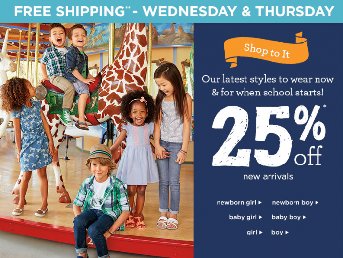Through tomorrow, score FREE shipping on any order at Gymboree! This is a great opportunity to use this special voucher $8 for $20 to Spend In-Store and Online on Kids’ Clothes at Gymboree!