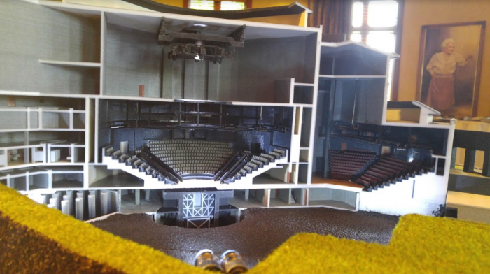 Here’s a model of what the inside of the theatre will look like. See that HUGE space above. they are going to be able to move in entire scenes from above and below while the audience watches. It will be magical! There is a giant pit that goes underground almost has much as the building is high!
