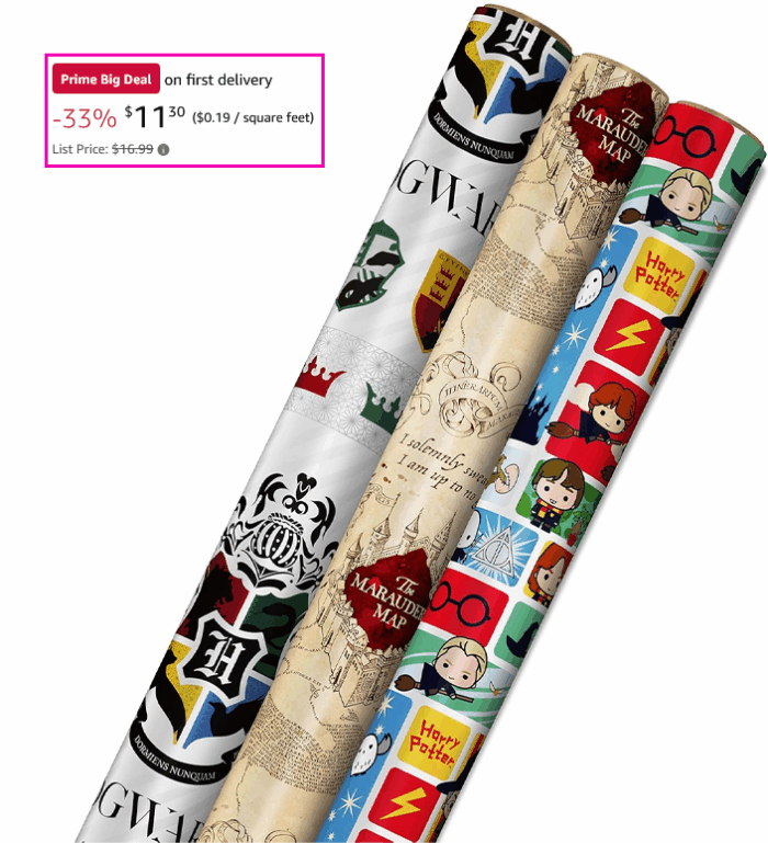 Hallmark Harry Potter Wrapping Paper with Cut Lines, 3-Pack: 60 sq. ft., for $11.30 (Reg $16.99)!