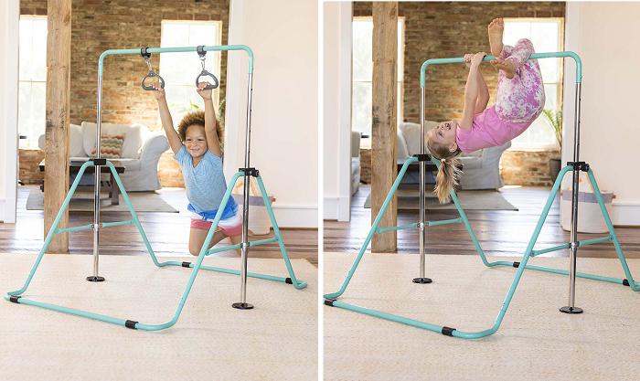 Your little one can practice all the gym fundamentals on this bar and ring set that adjusts to their height.