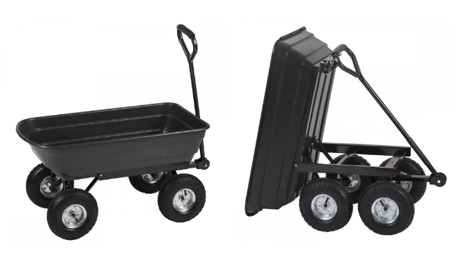 This Garden Dump Cart is a transportation tool that makes moving and unloading supplies around the yard seem effortless when working on gardening and landscaping projects. Made of a high-strength poly with a steel frame and black finish, this cart is cleans easily and rust resistant to provide years of dependable service. The Cart saves time and reduces fatigue by allowing the user to move up to 350-pounds of supplies around the yard and features a patented quick-release dump design to make unloading fast and easy. The 10-inch pneumatic turf tires, 5/8-inch diameter axle and straight padded handle are designed to tackle any terrain and makes this dump cart easy to move even when hauling heavy dirt, mulch, gravel or plants.