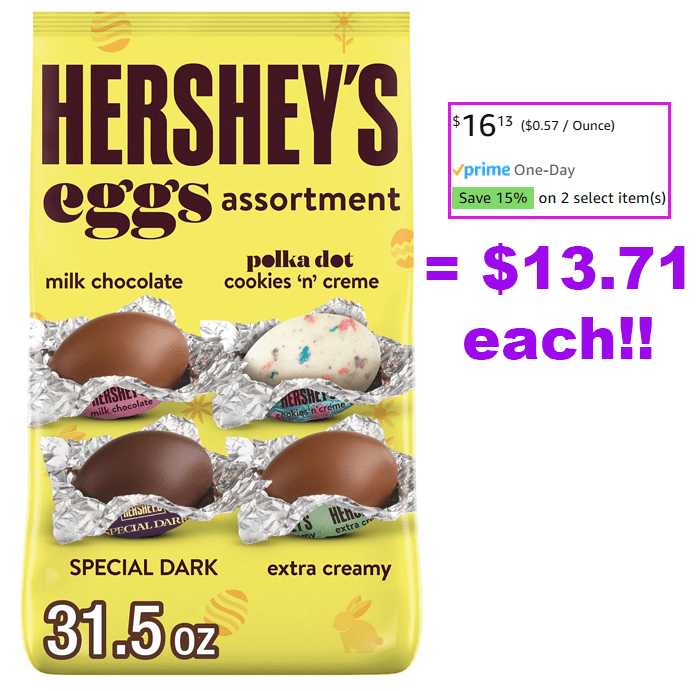 - Add TWO to your cart because they’re part of a Buy 2, save 15% Hershey’s Easter promo found HERE (there is more candy on the promo, too!)