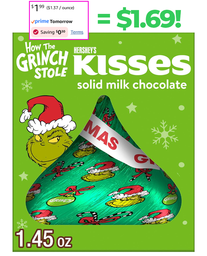 HERSHEY’S KISSES Grinch Solid Milk Chocolate, 1.45 oz for $1.99