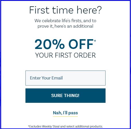 Sign up to receive their email, and you’ll get 20% off your first order! The code will automatically appear at the top of the screen when you enter your email in the pop-up box.