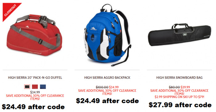 That makes the High Sierra 20″ Pack-N-Go Duffer and the High Sierra Aggro Backpack only $24.49! There’s a High Sierra Snowboard Bag for only $27.99!