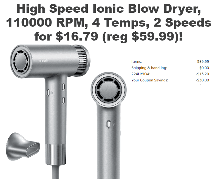 High Speed Ionic Blow Dryer, 110000 RPM, 4 Temps, 2 Speeds for $59.99