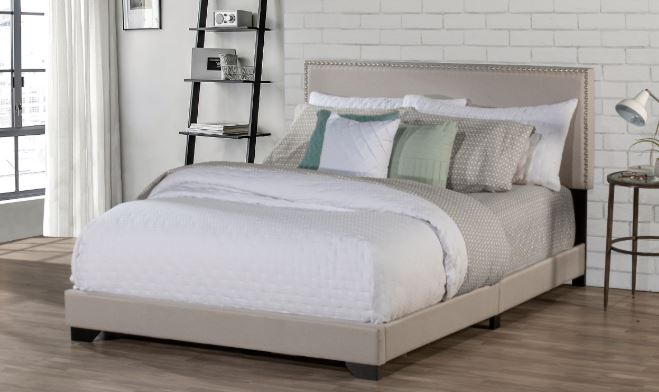 - Classic profile upholstered bed, with silver-hued nailhead trim