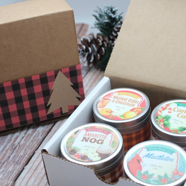 These candle boxes are so fun and would make a great gift! There are 2 choices: Buffalo Plaid or Warm Sweater. These candles are made with 100% soy wax and natural cotton core wicks for a little-to-no soot effect. All candles are hand-poured.