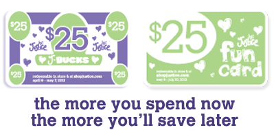 *The $50 back is for a $25 Justice J-Bucks AND a $25 in Justice Fun Money to on purchases made April 9-May 7.