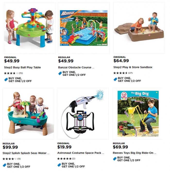 Select toys found HERE are Buy One, Get One 1/2 Off. Just look for the blue tag that shows the BOGO 1/2 off deal. Plus you can stack that promo with code TREEBUD for 15% off as well as BEACH20 for another 20% off! Basically when it’s all said and done, you’ll get two toys for about what you’d pay for one! There are a ton of different combinations, including water slides, water guns, swimming pools, sprinklers, sand toys, and more!