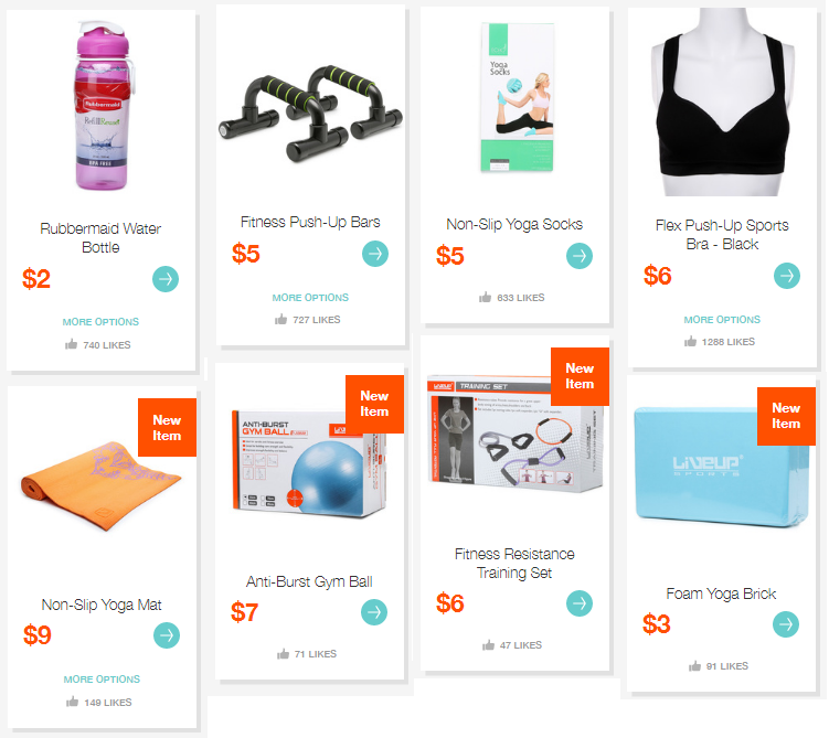 Items start at $2, and there are tons of weight training and yoga equipment. You can get great deals on water bottles, and sports bras are only $6!