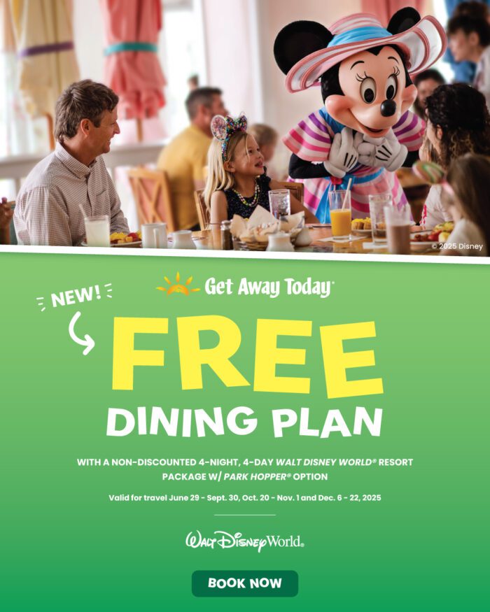 Get Away Today can also help you decide if a FREE dining plan with the purchase of a non-discounted, 4-night, 4-day Walt Disney Resort package with Park Hopper option would better suit your needs. They recommend you book by phone to discuss this option and you can call them at 855-GET-AWAY. The dates this plan is valid are June 29 – Sept. 30, Oct. 20 – Nov. 1 and Dec. 6-22, 2025. Don’t forget to tell them Utah Sweet Savings sent you for the VERY best price!