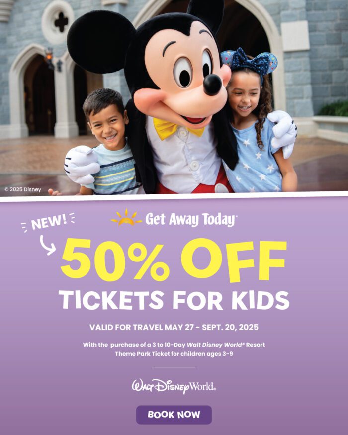 If you’re going specifically during May 27 – Sept. 20, you can take advantage of the Kids 50% Ticket Offer and save 50% on the purchase of a 3- to 10-Day Disney Theme Park Ticket for children ages 3-9!