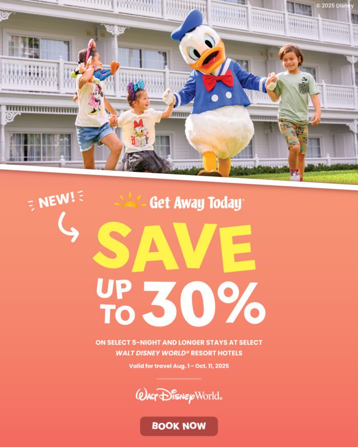 Finally, they have an amazing offer on Disney Resort hotels, too! Save up to 30% on 5-night and longer stays between Aug. 1 – Oct. 11, 2025.