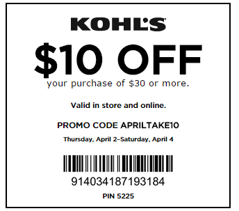 Kohl’s just released a New Code that will get you $10/$30 – Use code APRILTAKE10 at checkout. Today only, you if you have a Kohl’s Card, you will be able to stack the 30%, free shipping, and the NEW code! WOW!!