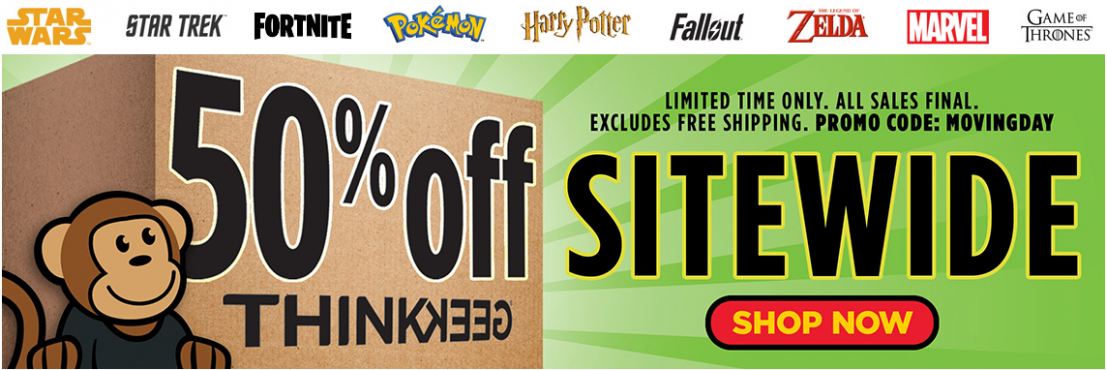 On July 2nd, ThinkGeek is moving in with GameStop, so their website will be closing. In preparation for the change, they’re having a HUGE sale! Use code MOVINGDAY to get 50% off a huge selection of popular fandom products including Disney, Harry Potter, Star Wars, Star Trek, Pokemon, Game of Thrones, Marvel, Fortnite, Fallout, and much more! Check out a few of these deals.