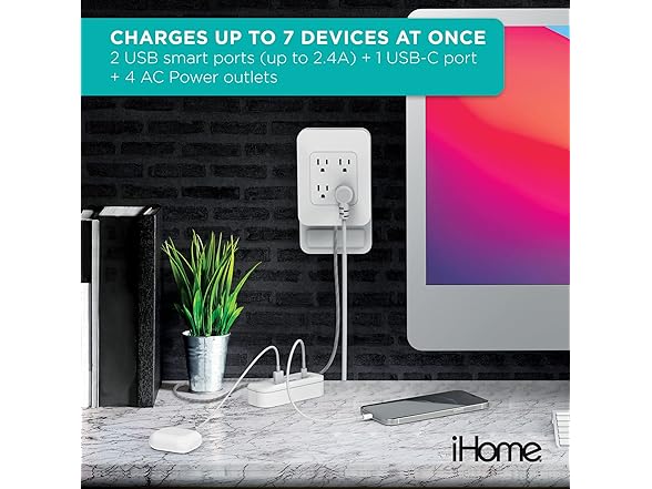 - PLENTY OF OUTLETS FOR ALL YOUR NEEDS: iHome’s multi plug outlet allows you to charge up to 7 devices, all at once – 4 AC outlets, 2 USB-A smart ports and 1 USB-C port. Equipped with 2.4 A smart ports for maximum power and a 20W USB-C power delivery port to fast charge up to 50% in 30 minutes.