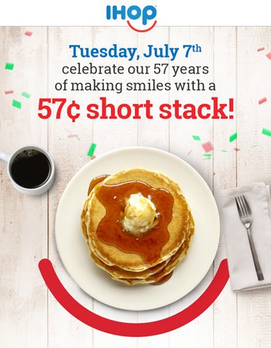 Tuesday, July 7th, IHOP is offering a short stack of their World Famous Buttermilk Pancakes for only $0.57! This deal runs from 7am to 7pm.
