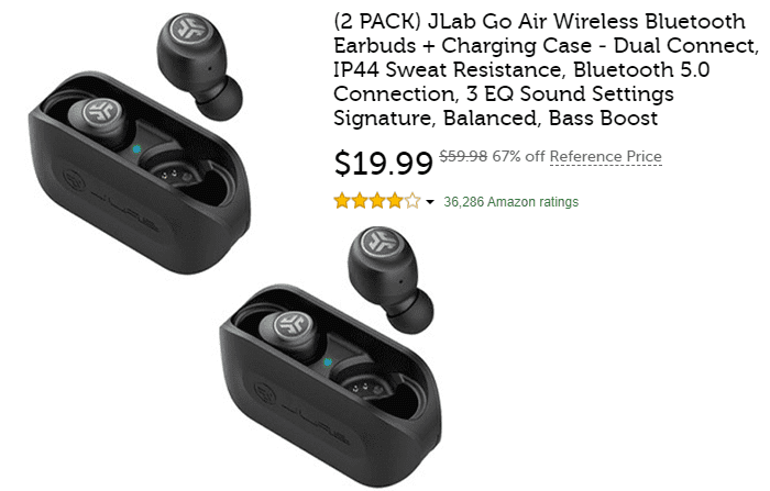 JLab Go Air Wireless Bluetooth Earbuds, 2-Pack for $19.99 (Reg $59.98)!