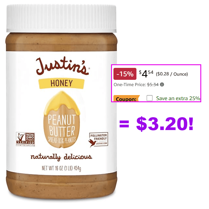 Justin’s Honey Peanut Butter, 16oz Jar for $5.34