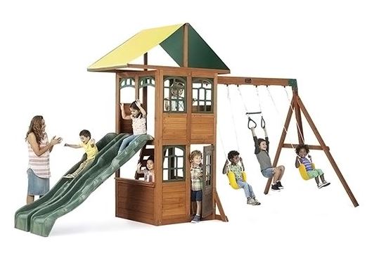 This double-decker play set is packed with plenty of features to keep your little ones entertained and active! It features a rock climbing wall, two slides, swings, and a double-decker play house!