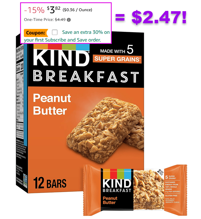 KIND Breakfast Bars, Peanut Butter, Gluten Free, 100% Whole Grains, 1.76 OZ Packs, 6 Count for $4.49