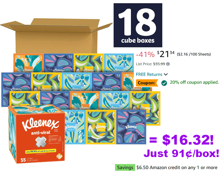 - Pay $16.32 or $18.83, that’s as low as 91¢/box, plus you’ll automatically earn a $6.50 Amazon credit fo your purchase!! That’s like paying $9.82 for a pack of 18 Kleenex cubes!
