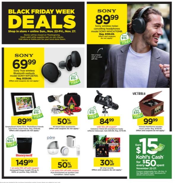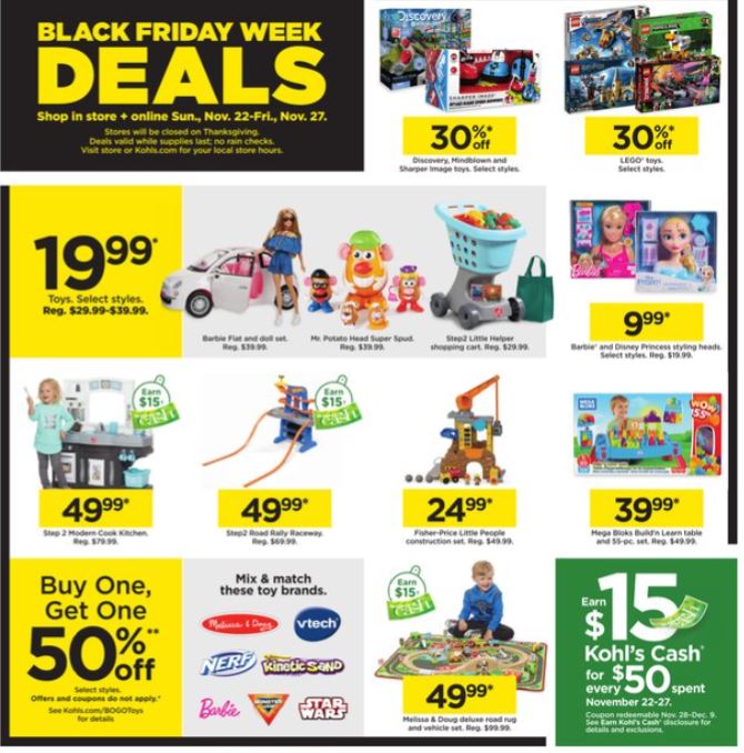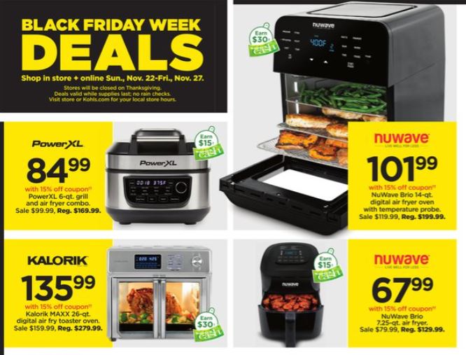 - Earn $15 Kohl’s Cash for every $50 spent November 22-27