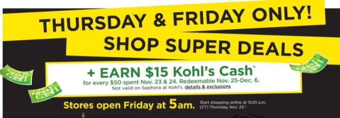 Remember, all of the rest of the Black Friday Deals are still LIVE!! You will now earn $15 in Kohl’s Cash when you spend $50!!