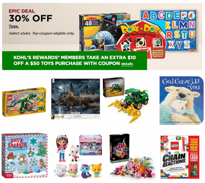 Kohl’s Up to 30% Off + $10 off $50 Toys Promo! Plus Earn Kohl’s Cash & Rewards!