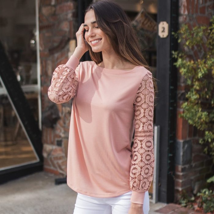The pretty lace sleeve ads a nice touch of feminine elegance to this top! Choose from 4 colors.