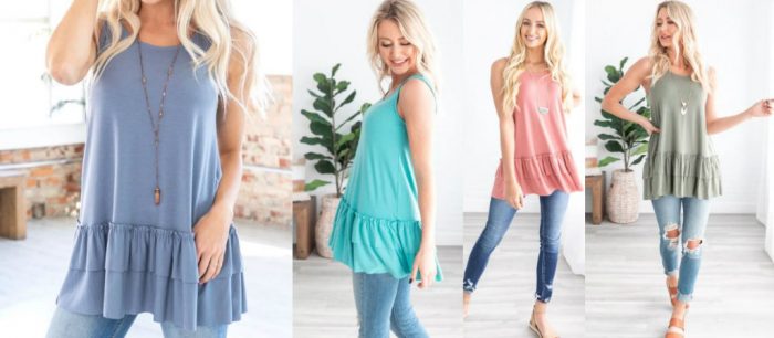 I think that this Ruffle Bottom Tank is so cute! It’s perfect for layering as the weather changes. Choose from 9 different color options.