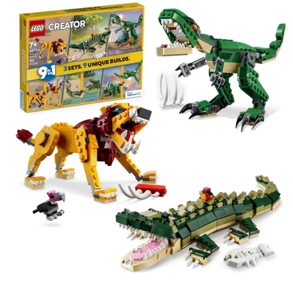 - In the three included sets, Mighty Dinosaur can become a T-rex, a Triceratops or a Pterodactyl. Crocodile can be rebuilt into a movable Croc, Snake, or Frog, and Wild Lion can also become an Ostrich or Warthog. (852 pieces total)
