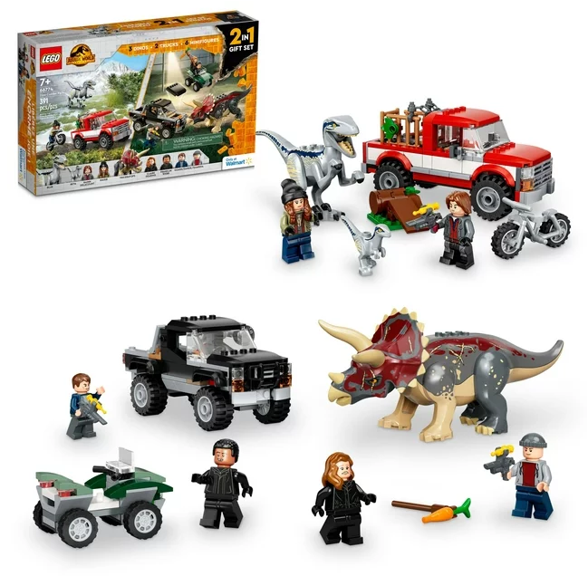 - Play out action-packed adventures with 76950 LEGO Jurassic World Triceratops Pickup Truck Ambush and 76946 LEGO Jurassic World Blue & Beta Velociraptor Capture, together in a single set (391 pcs total)