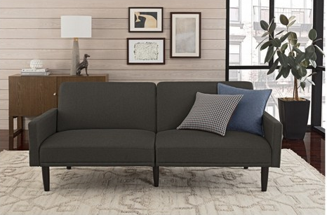 Utilize your living space with this Linen Futon with Arms from Room Essentials. It easily transitions from sofa to bed and back again so you can have guests stay over without giving up your own bed space or making them sleep on the couch. Dress up the futon with colorful throw pillows for decoration and to add your own personality to the piece.