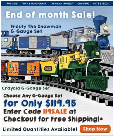 Now’s your chance to get your train over at LionelStore.com. Enter code 119SALE to get any G-Gauge Set for just $119.95! Most of these are regularly $150-$200.