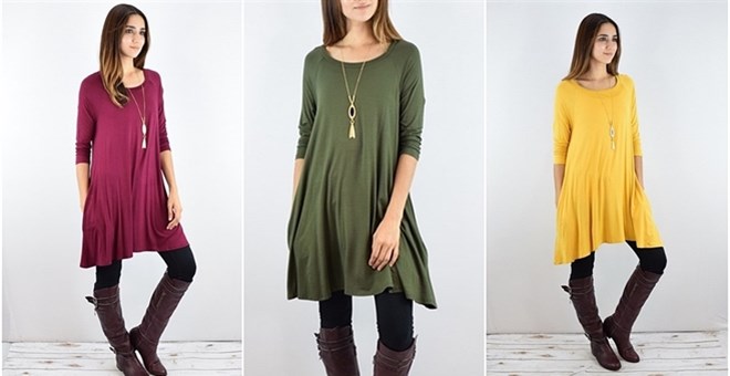 These A-Line Raglan Tunics are perfect with leggings! Choose from a variety of solid colors, including solid black and charcoal. These are also only $12.99!