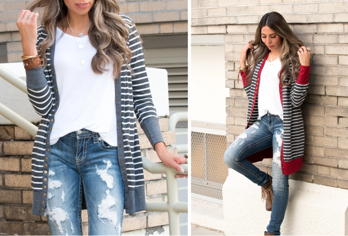 Is this cardigan not perfect? I love my snap cardigans, and this one is longer AND has stripes! I love the color blocking too. Choose from 6 colors! This price is the best we’ve seen!