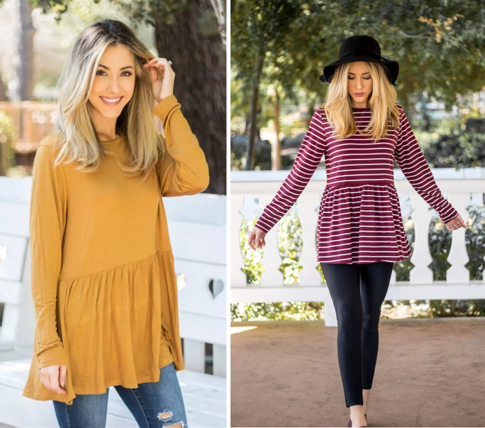I love the flowy style of peplum tops, and these have long sleeves so they’re perfect for the season! There are a couple of options available.