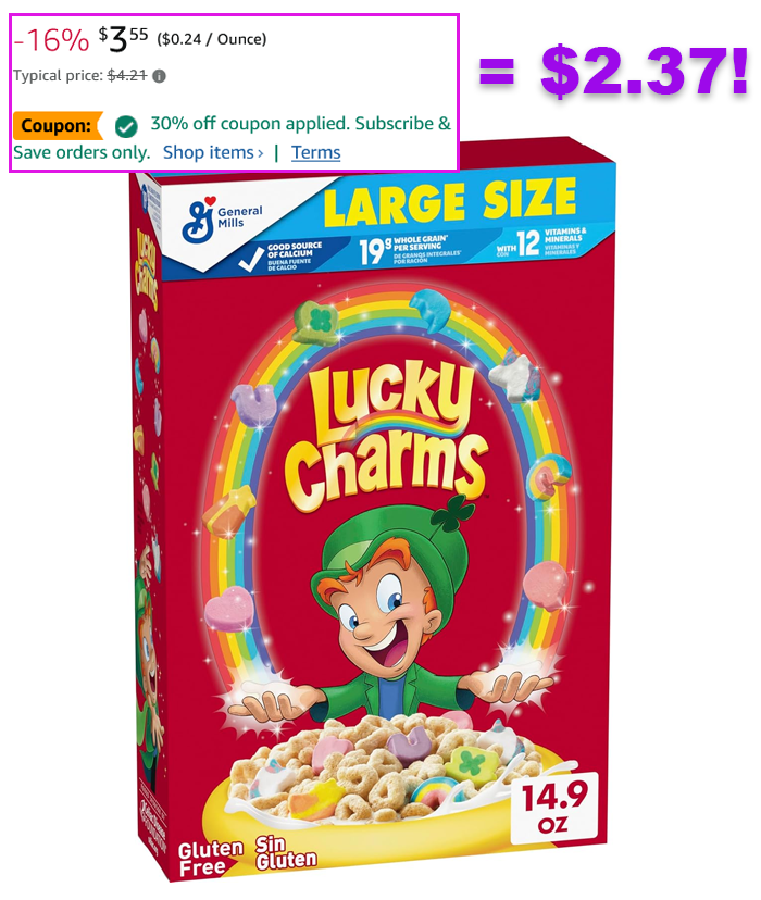Lucky Charms Cereal, Gluten Free, Large Size, 14.9 oz for $3.95 (Reg $4.21)