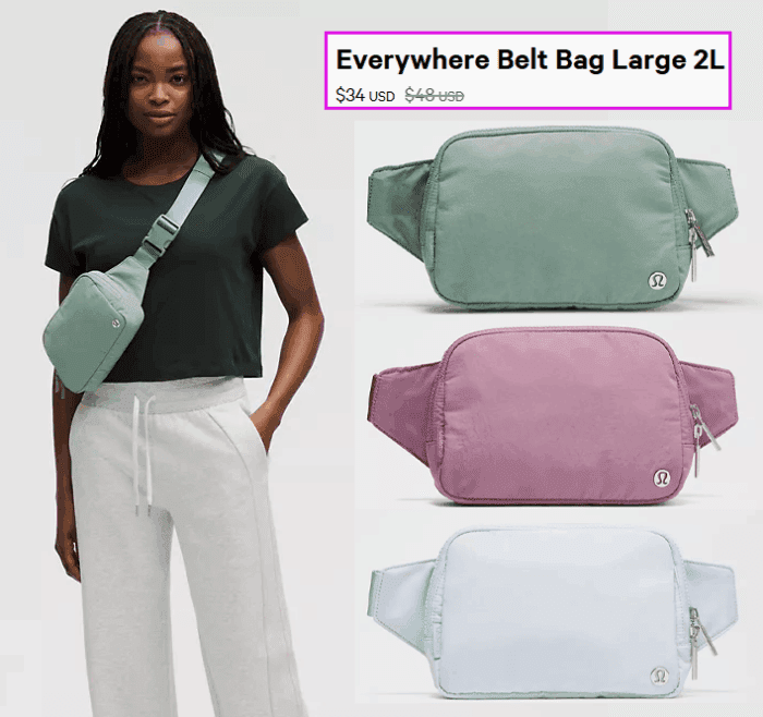 lululemon Everywhere Belt Bag 1L, Lavender Lux, Starch Blue, Crater Blue, Pink Dragonfruit for $29 (reg $38)