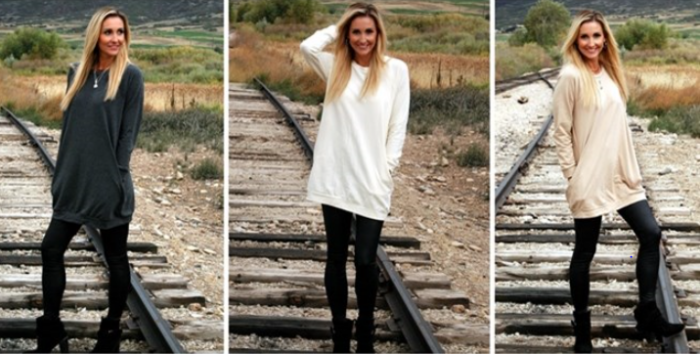 - We have found the ultimate top for your leggings this fall! We have gone crazy over this SUPER SOFT, sweatshirt dress. The fabric is not only cozy, but drapes well and is warm. The long length, fun pocket detailing and loose fit make this ultra flattering and perfect for any body type. Just throw it over your leggings or jeans for a comfy, chic winter look!