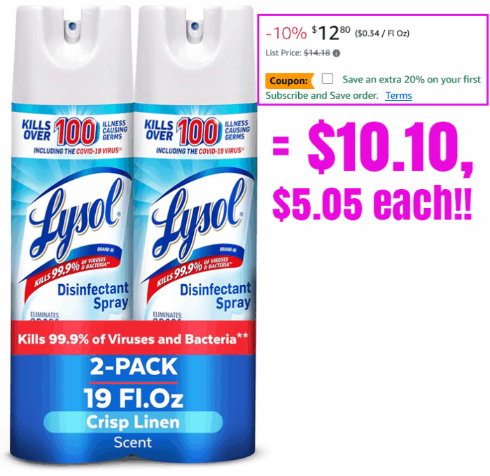 Lysol Disinfectant Spray & Deodorizer, Crisp Linen,19 Fl Oz (Pack of 2) for $13.47 (Reg $14.18)