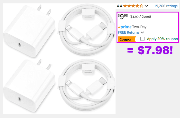 MAILESI 2-Pack 20W Type C Fast Charger Blocks with 6FT USB C Charger Cables for $9.98